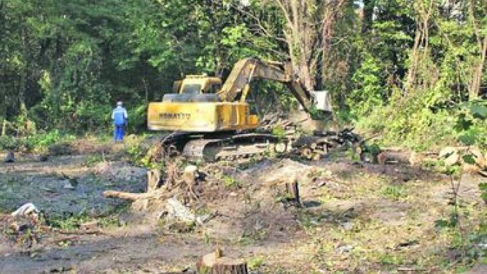 В Голосеевском районе — очередной стройскандал. Рядом с жилой высоткой на ул. Ломоносова, 83-а, за неделю вырубили около сотни полувековых деревьев ради строительства многоэтажек. Возмущенные местные жители вчера утром перекрыли движение транспорта по ул. Ломоносова и потребовали прекратить вырубку леса. Но застройщик уверяет, что все документы на строительство у него есть.