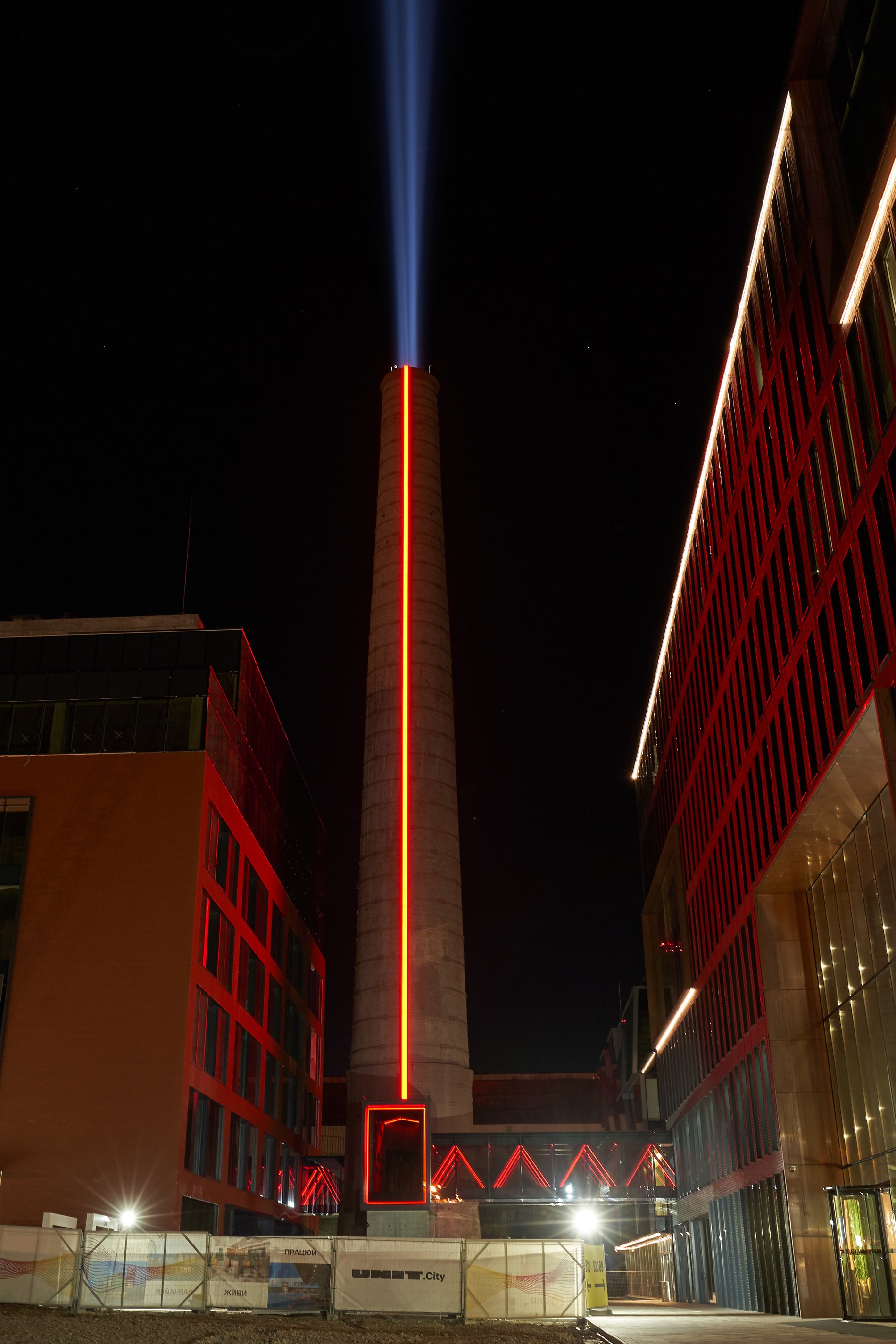Кроме планетария, в трубе установили прожектор, благодаря которому ночью из трубы будет бить луч яркого света. Луч достигает вершины и направляется в небо. Длина луча света достигает 100 метров при диаметре основания в 3,5 метра.