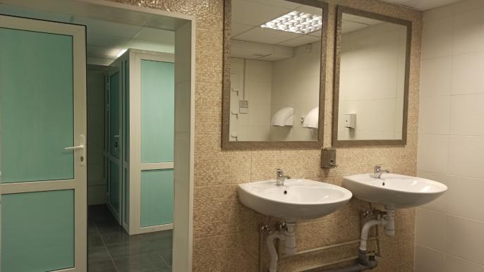 Во время капитального ремонта были заменены все инженерные сети, обновлены сантехнические приборы, плитка на стенах и полу, приборы освещения, установлены новые туалетные кабинки, оборудована отдельная туалетная кабина с доступом для людей с инвалидностью.