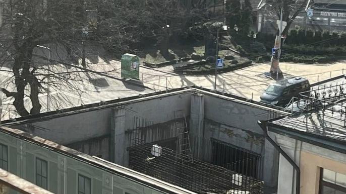 СтройОбзор нагадує, що півтораповерхову споруду затягнули будівельною сіткою з намальованим фасадом, за яким виявився каркас нової бетонної будівлі.