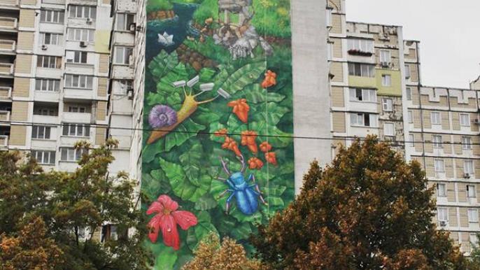 В Киеве на Харьковском массиве появился новый сюрреалистический мурал. Рисунок представляет исторический и современный контекст жилого массива.