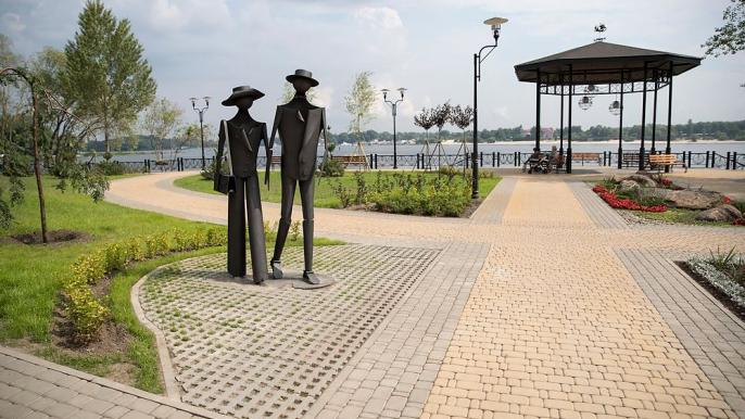 Здесь провели работы по благоустройству и обустройству дорожек, нового освещения, оросительной системы, укрепили прибрежную зону, установили декоративную обзорную беседку, с которой открывается вид на Днепр.