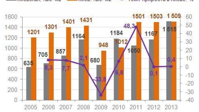 Прирост объема введенного в эксплуатацию жилья в Киеве, в сравнении с 2012 годом составил 5,6 тыс.кв. м или 0,4%. Тогда как в Киевской области в 2013 году было введено на 29,8% или 347 тыс. кв. м жилой площади больше, чем в 2012 году (1 167 тыс. кв. м).