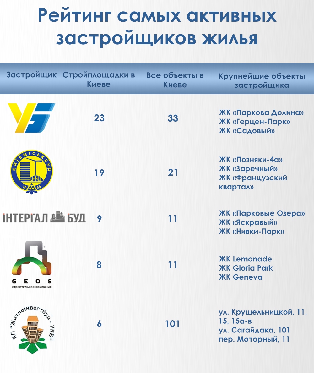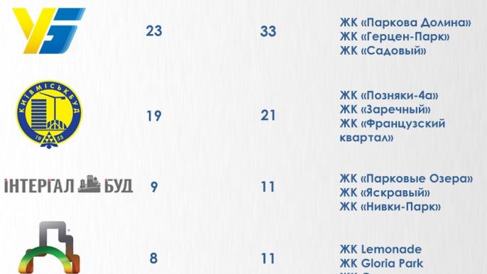 Неоспоримыми лидерами стали компания "Укрбуд" и холдинговая компания "Киевгорстрой", каждая из которых продает квартиры на более чем 20 объектах.