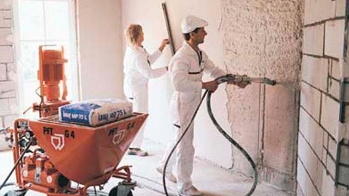 Для того чтобы избежать временных затрат на приготовление раствора и его нанесение на стены, строительные организации используют такой метод, как машинная штукатурка. Посредством специализированной техники раствор равномерно наносится на стены.