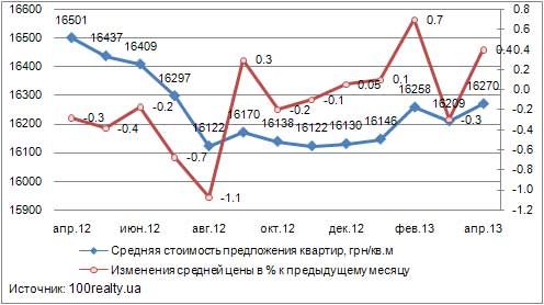 Относительно апреля 2012 года, средняя цена 1 кв. м жилья уменьшилась на 1,4%. Индекс роста составил 0,99.