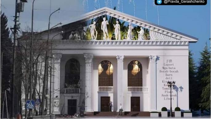 Кадры варварского разрушения Драмтеатра в Мариуполе облетели весь мир. А таким он может стать после освобождения и восстановления города: со скульптурами на фронтоне, фонтанами на крыше и надписью «Дети» на разных языках мира.