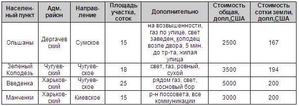 К самым дешевым можно отнести следующие населенные пункты пригорода Харькова: Ольшаны, Зеленый Колодец, Введенка, Манченки, Безруки, Буды, Лизогубовка. Каменная Яруга.