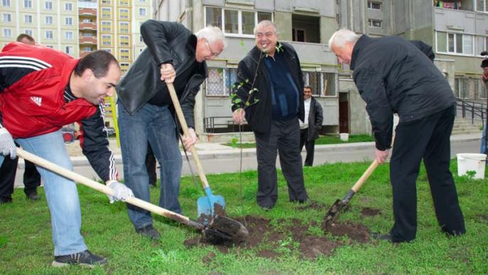 Его появление на площадке добавило энтузиазма трудящимся. Не тратя время попусту, Эмиль Шаваршович принялся за посадку молодых деревьев. Один, два, три — и вот свежий ветер колышет верхушки молодой рощицы, посаженной уверенной рукой Тер-Степаняна. Президент КДСК авторитетно объясняет соратникам, как именно нужно сажать деревья: