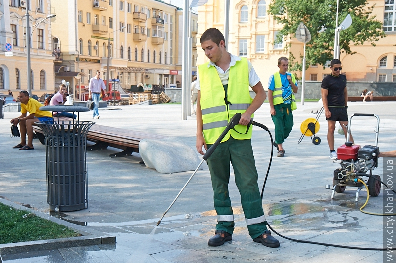 Как сообщил директор фирмы «Клинтехинвест» Антон Ена, наводить порядок на реконструируемой площади начали 13 августа, а закончат - в ночь на 23 августа. Всего в уборке задействовано 10 единиц техники: подметальная машина, пылесос, две поломоечные машины, две мойки, парогенератор и пеногенератор, две машины для чистки ступеней и для глубокой чистки мрамора, гранита. Так, специалисты фирмы сейчас чистят всю территорию площади: подметают проезжую часть, моют плиты и лавки, чистят от пятен поверхности, на которых остались следы от езды роллеров и скейтеров, покрывают защитным слоем опоры освещения и т.п.