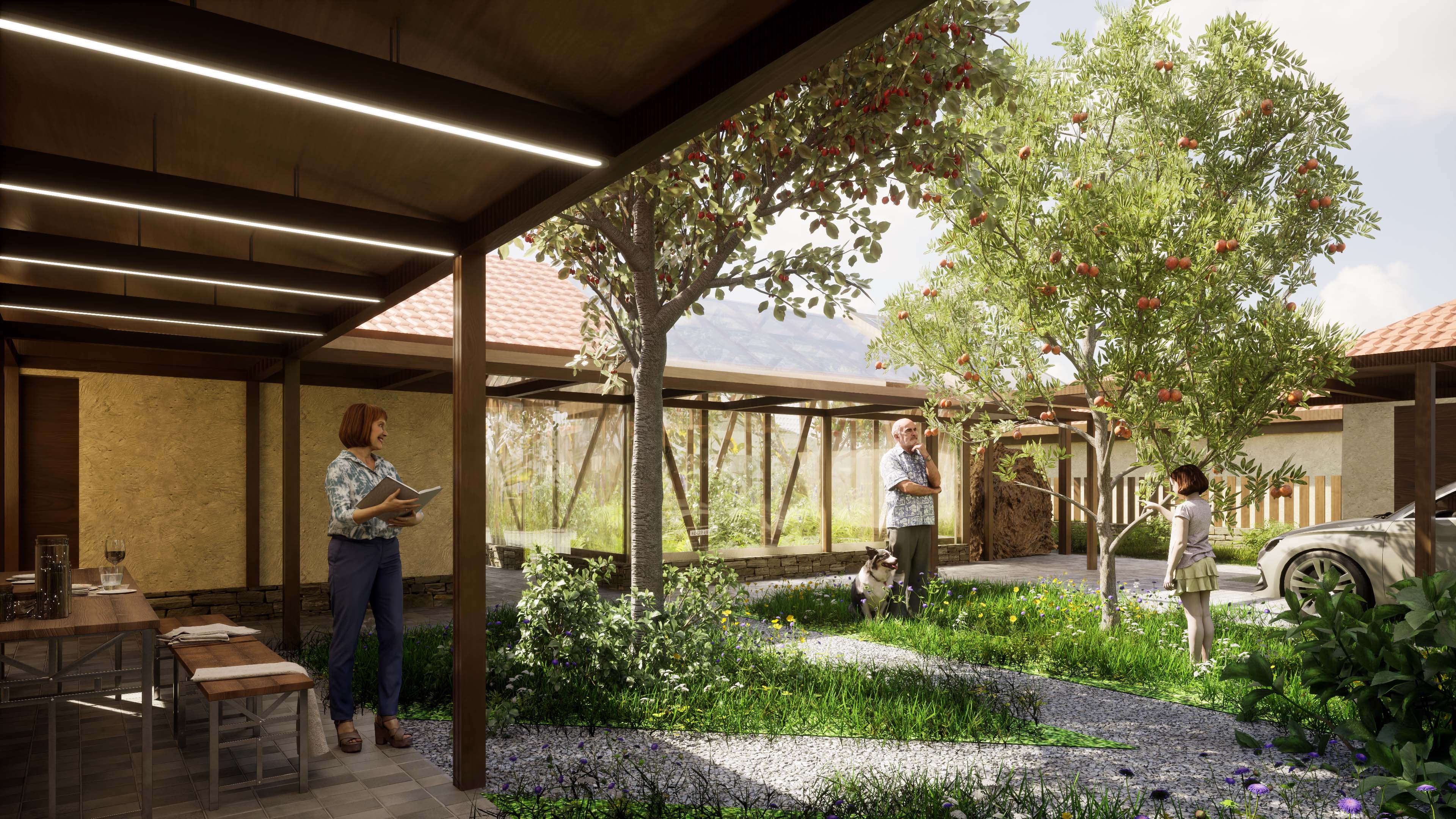 Щоб захиститися від пекучого сонця, архітектори пропонують облаштувати по периметру кожного двору перголи та галереї, сформувавши патіо. Тут, в подальшому, ростимуть фруктові дерева.