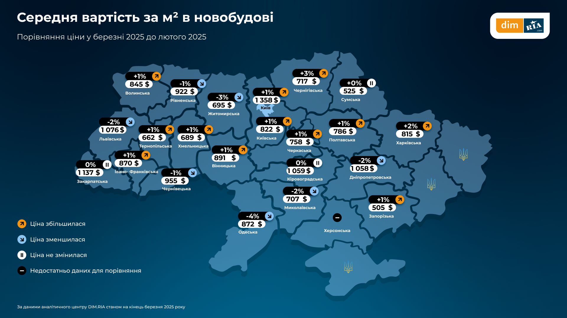 Найдорожчим регіоном залишається Київ, де середня ціна за квадратний метр на первинному ринку становить $1 358.