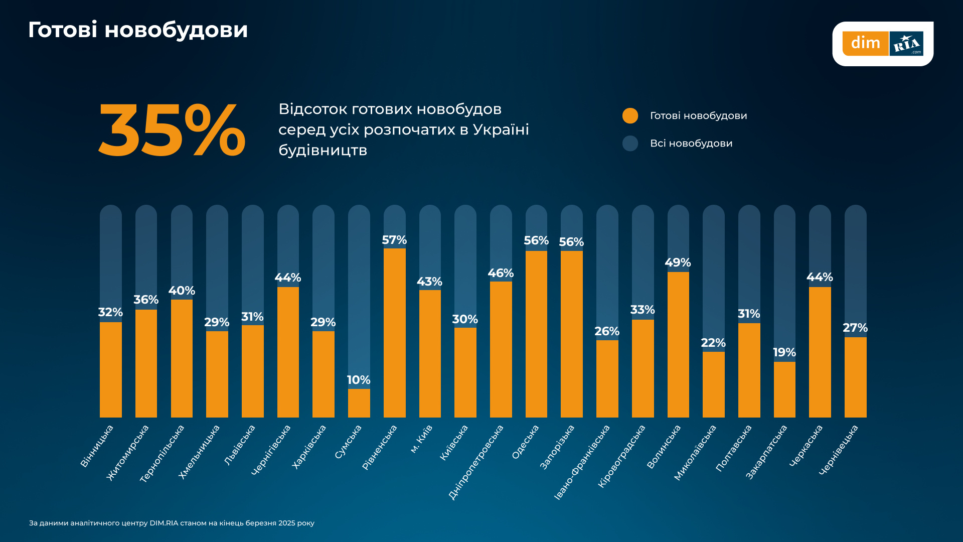 Найбільший відсоток завершених проєктів — у Рівненській, Одеській та Запорізькій областях (56–57%). Також високий рівень добудованих обʼєктів спостерігається у Волинській, Дніпропетровській, Черкаській та Чернігівській областях — понад 40%.