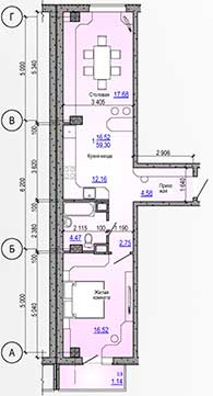В 1-й секции квартиры №63 (9-й этаж, площадь 59,2 м²), №70 (10-й этаж, площадь 58,2 м²) и №77 (11-й этаж, площадь 58,2 м²).