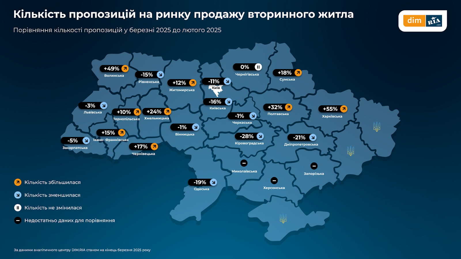 У березні 2025 року порівняно з лютим на ринку вторинного житла найсуттєвіше збільшилась кількість пропозицій у Харківській, Полтавській та Хмельницькій областях