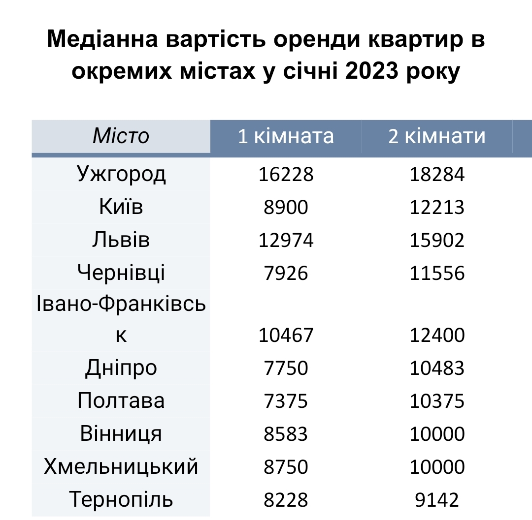 У Дніпрі ціни навпаки зросли. Так, медіанна вартість оренди 1-кімнатного помешкання в березні 2022 року становила 6 313 гривень. У серпні ціна підскочила до 8 438 гривень. Однак уже в січні дещо стабілізувалася до 7 063 гривень на місяць. 2-кімнатні здорожчали в середньому на 14%: з 8 300 гривень в березні до 9 469 гривень у січні 2023-го, а 3-кімнатні квартири — на 13%: з 10 063 гривень до 11 375 гривень на місяць.