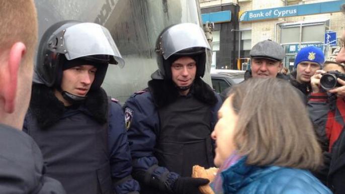 Дипломат подошла к стоящим на Майдане представителям Внутренних войск и предложила им печенье. Правоохранители угощенье взяли, не проронив ни слова, поблагодарили В.Нуланд улыбками.