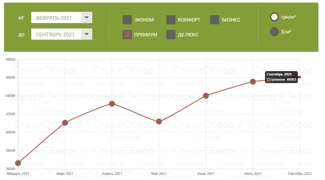 Стоимость метра квадратного в сегменте «премиум» - 46 083 грн. Таким образом стоимость за месяц поднялась на 1%.