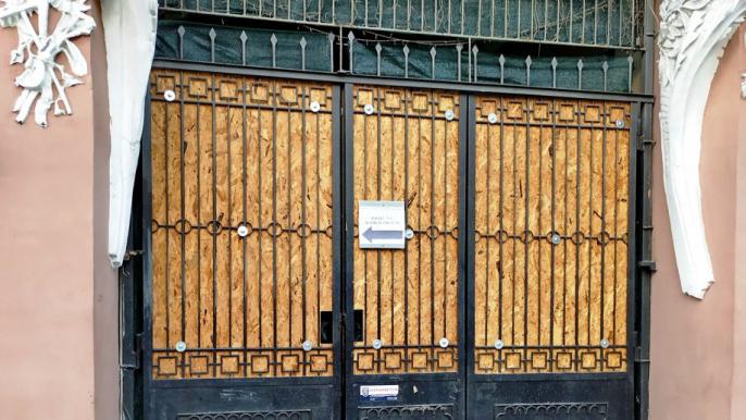 Вход в здание со стороны ул. Преображенской заколотили. А, по словам блогера, через щели можно увидеть мешки со строительным мусором.