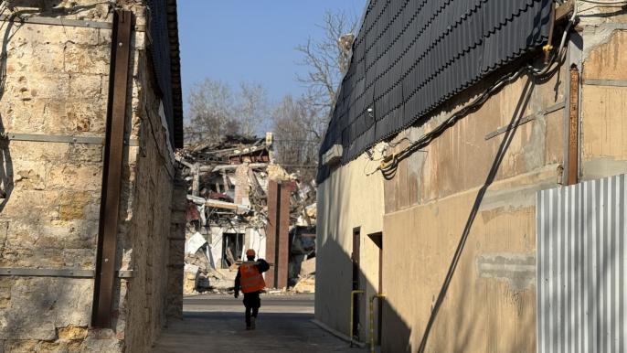 розповів, що по периметру об'єкта вже встановлено паркан та проводяться підготовчі роботи для підсилення стін першого поверху. Роботи планується завершити до кінця поточного року.