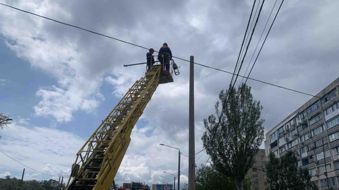 Фахівці виконують роботи із знешкодження обривів мереж зовнішнього вуличного освітлення, монтаж, демонтаж кабелів повітряних ліній, кронштейнів, світильників, заміну ламп та інше.