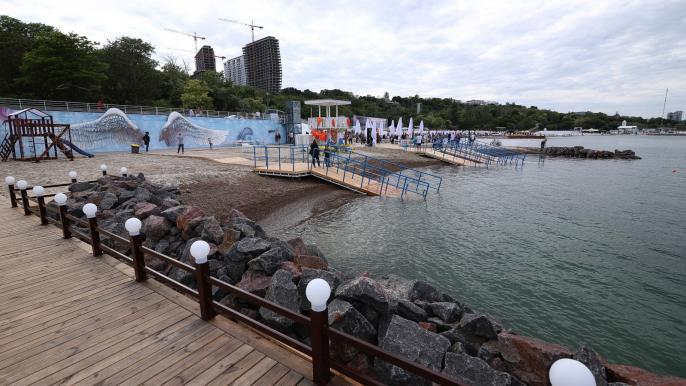 Кроме того, на пляже разместились две детские площадки, одна из которых инклюзивная, а также зона для занятий спортом.