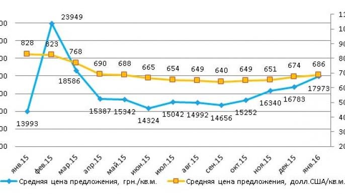 В январе 2016 года средняя цена предлагаемых к продаже квартир составляла 17973 грн./кв. м, относительно декабря 2015 года средняя цена увеличилась на 7,09%, передает СтройОбзор.
