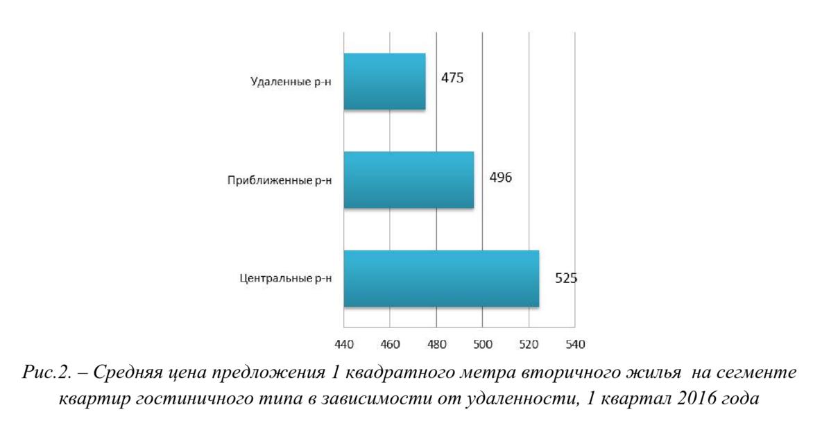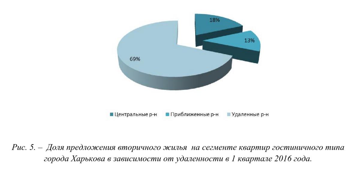 По итогу I квартала 2016 года анализ предложения в удаленных районах города составил 69% от всего объема предложения. Доля квартир гостиничного типа в центральных районах составила – 18%, в приближенных к центру районах – 13%.