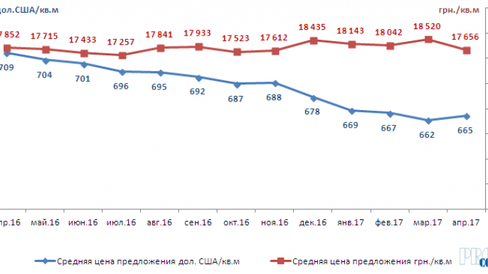 За апрель 2017 года зафиксировано незначительное увеличение средней цены предложения квартир на вторичном рынке Харькова в долларах США до 665 USD/кв. м (0,47%), в гривне – снижение на -2,31%.