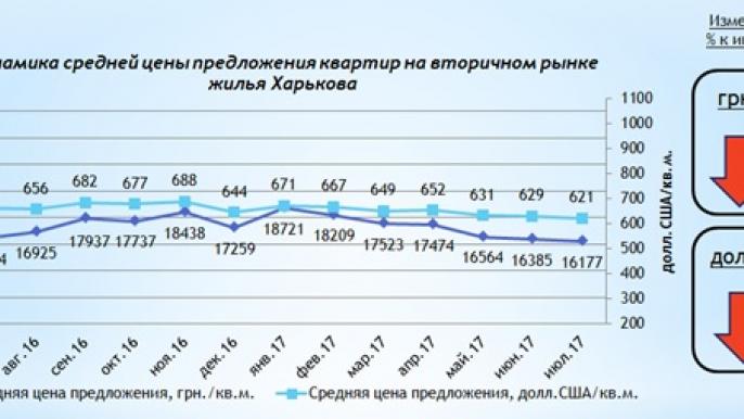 Средняя цена предложения квартир на вторичном рынке жилой недвижимости Харькова в июле отмечена на уровне 16 177 грн./кв. м., относительно июня 2017 года значение среднего показателя снизилось на 1,28%.