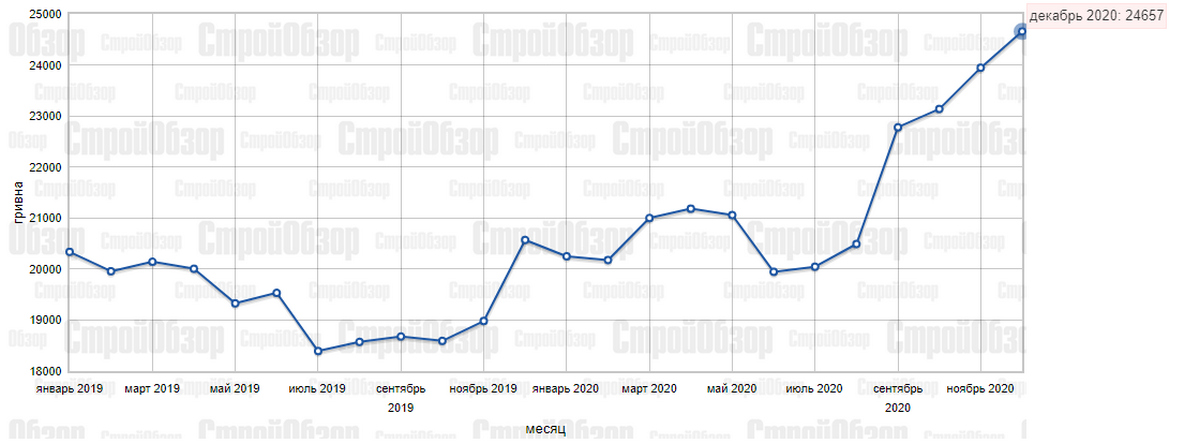 Согласно данным графиков СтройОбзора, цена в уходящем месяце поднялась на 3% по сравнению с ноябрем и составила 21 499 грн. за квадратный метр (в последний месяц осени – 20 871 грн. за кв. м).