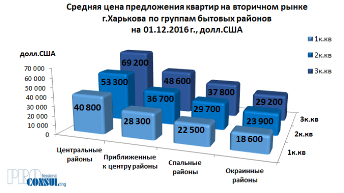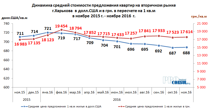 За ноябрь 2016 года зафиксирован незначительный рост средней цены предложения жилой недвижимости на вторичном рынке Харькова в долларах США – на 0,11%, с 687 USD/кв.м на начало ноября до 688 USD/кв.м на начало декабря.