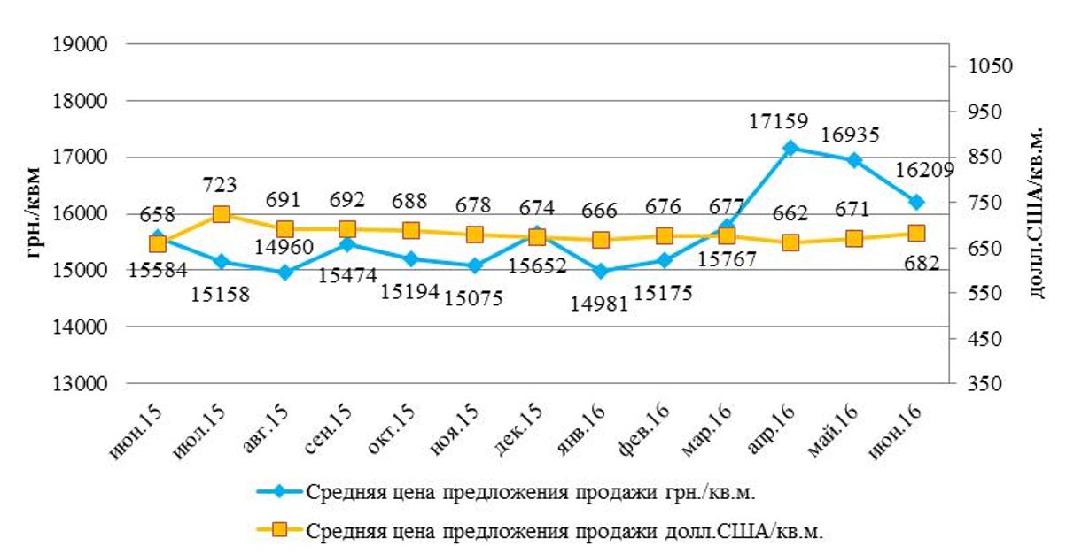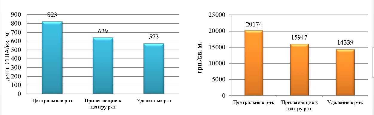 - в центральных районах – в долларах 823 долл. США/кв. м., в гривнах 20 174 грн./кв. м.