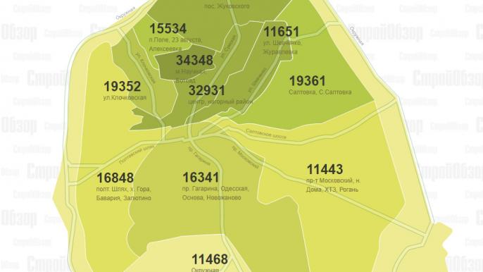 Стоимость квартир на Салтовке на сегодня составляет 19 361 грн. за кв. м. Практически с такой же ценой после нее следует район улицы Клочковской и прилегающие территории – 19 352 грн. за кв. м. Затем – Полтавский шлях (Холодная гора), где цена составляет 16 848 грн. за «квадрат» и просп. Гагарина (Одесская) с показателем 16 341 грн. за кв. м.