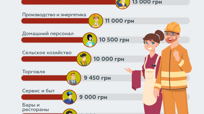 ТОП-3 закрывает сфера производства и энергетики - здесь работодатели готовы платить 11 000 грн. На 1 500 грн. больше получают в производстве в Киевской и Одесской областях - 12 500 грн., наименьшие зарплаты в Сумской области - примерно 8 000 грн. в месяц. Домашнему персоналу в Украине обещают 10 500 грн. в среднем.