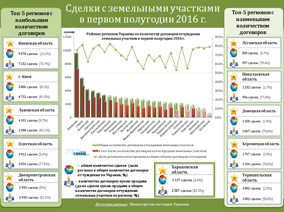 В целом наибольшее количество транзакций с отчуждением прав собственности на земельные участки в I полугодии 2016 года было осуществлено в Киевской области (9,6 тыс. сделок – 13,3% общего количества транзакций по Украине), Киеве (5,8 тыс. сделок – 8,1%), Львовской (4,1 тыс. сделок – 5,7%), Одесской (3,9 тыс. сделок – 5,4%), Днепропетровской (3,6 тыс. сделок – 5%) области.