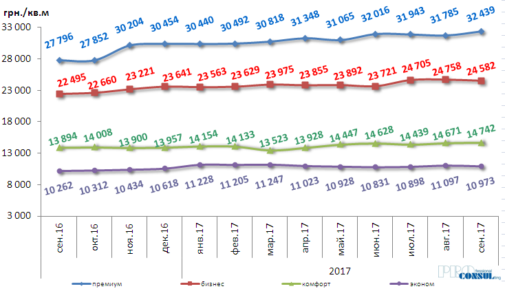 Средневзвешенная цена предложения 1 кв. м квартир в новостройках Харькова за сентябрь 2017 года в гривне снизилась на 2,0% – с 17 336 грн. до 16 990 грн.