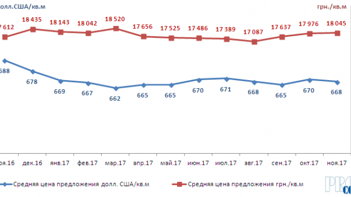 За ноябрь 2017 года средняя цена предложения жилой недвижимости на вторичном рынке Харькова в долларах США снизилась на 0,25% и на начало декабря составила 668 USD/кв. м. В гривне средняя цена предложения увеличилась на 0,44% и составила 18045 грн./кв. м.