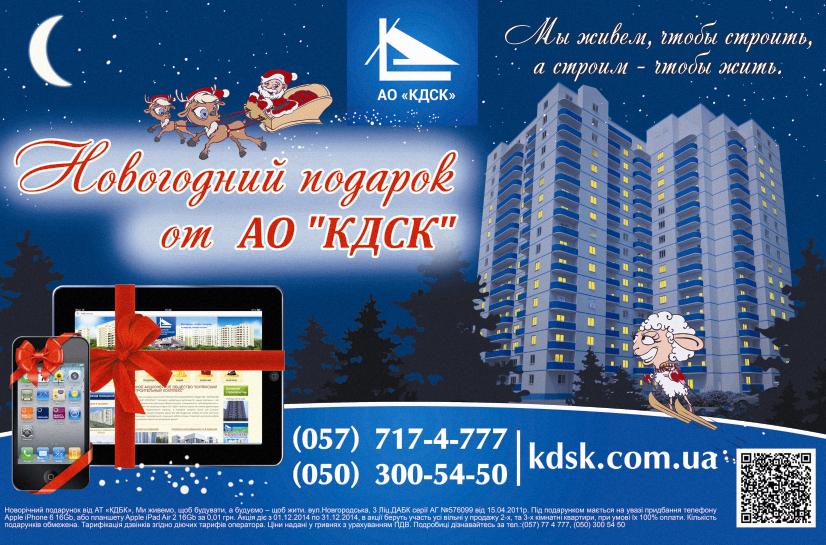 Каждому покупателю 2-х или 3-х комнатной квартиры, в любом из строящихся жилых домов АО «КДСК», в акционный период с 01.12.2014 по 31.12.2014, при условии 100% оплаты, Куряжский ДСК дарит Новогодний подарок на выбор: телефон Apple iPhone 6 или планшет Apple iPad Air 2