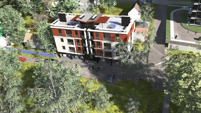 В доме 6 квартир от 45 кв.м., внутренний двор с палисадником, паркинг.