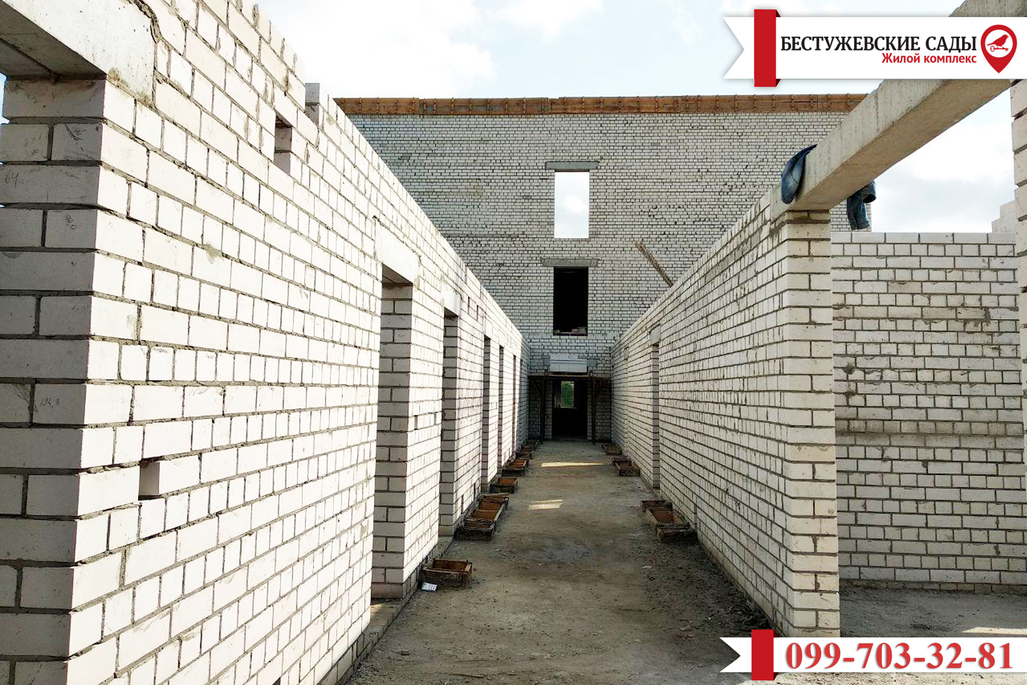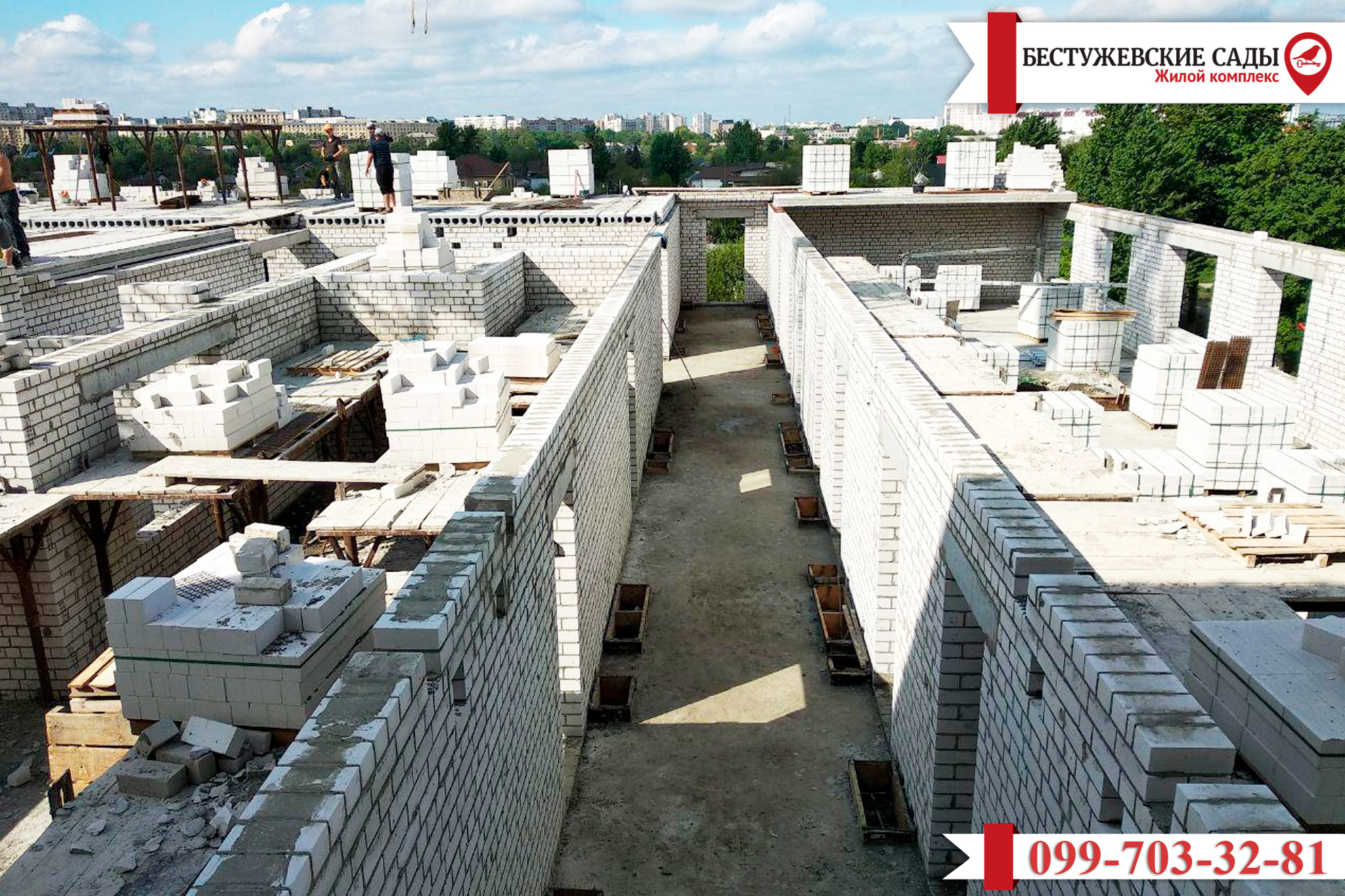 • в первой части, на пятом этаже, окончено перекрытие бетонными плитами и уже началось возведение кирпичных стен на шестом этаже;