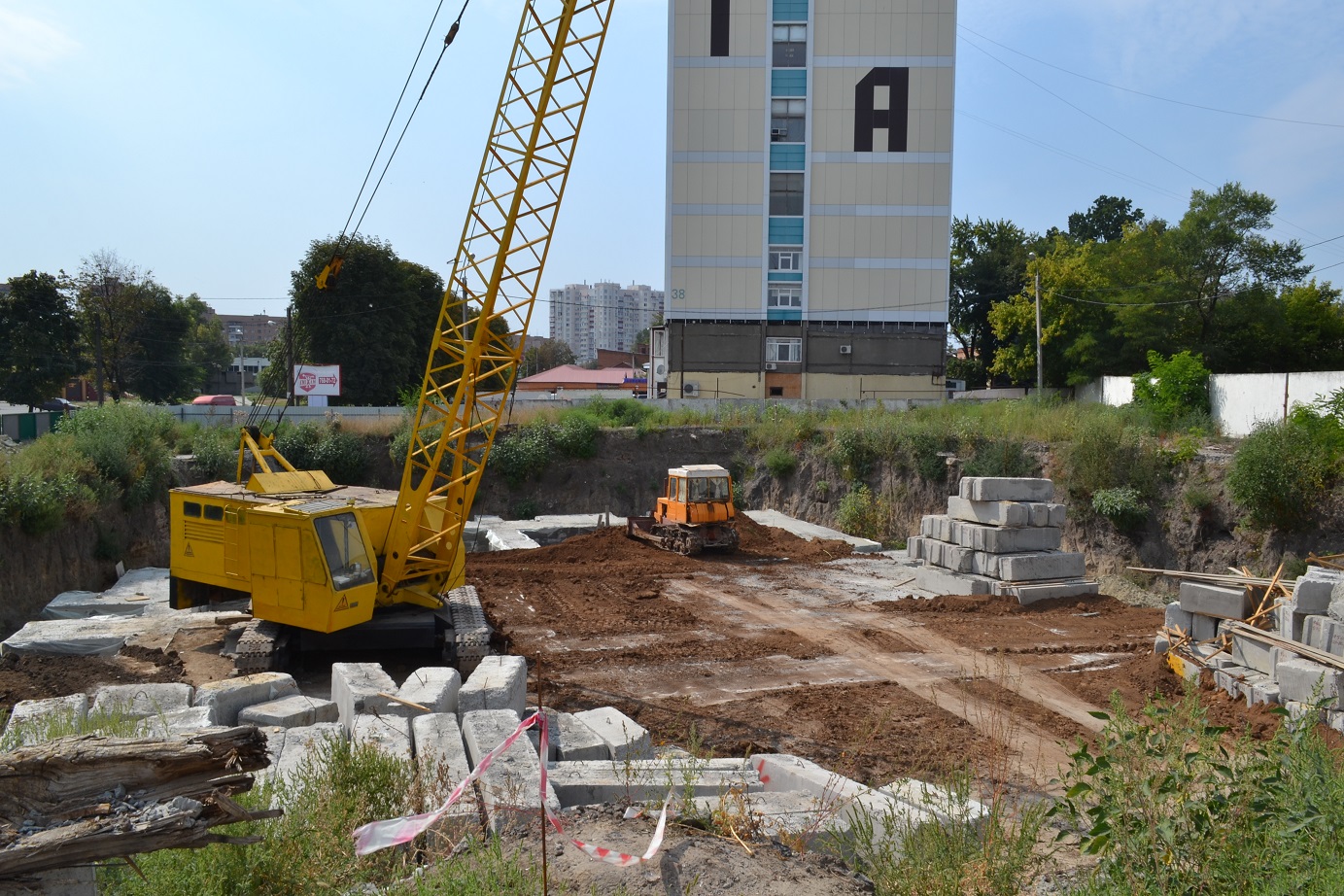 На строительной площадке дома № 4 ведется монтаж фундаментных блоков.