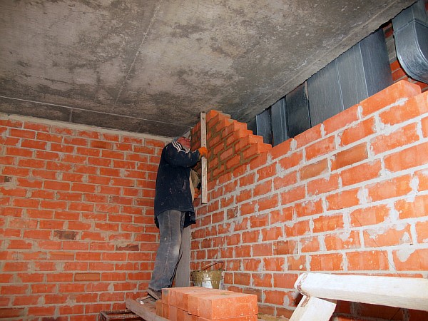 Первая бригада каменщиков занята подъемом и распределением по этажам кирпича для дальнейшей закладки вентиляционных и технологических проемов.