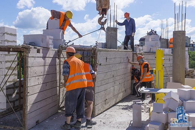 Сегодня каменщики завершают кладку внутренних перегородок на 5-м этаже и приступают к кладочным работам на 6-м этаже.