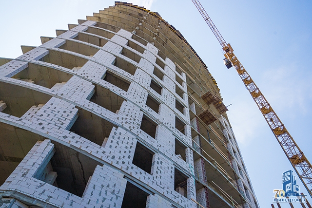 Каменщики завершили кладку стен на 9-м этаже, сейчас ведется кладка наружных стен и внутренних перегородок на 10-м этаже.