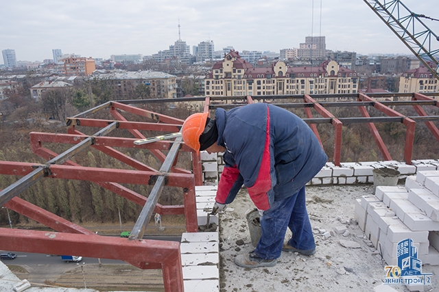 Строители СМУ-21 ОДО «Жилстрой-2» завершили возведение конструктива здания: выполнены работы по устройству покрытия над техэтажом, забетонирована повышенная часть покрытия, смонтированы металлоконструкции козырька, установлены вентиляторы, завершается кирпичная кладка парапета. Выполнена кладка межквартирных стен и внутренних перегородок.