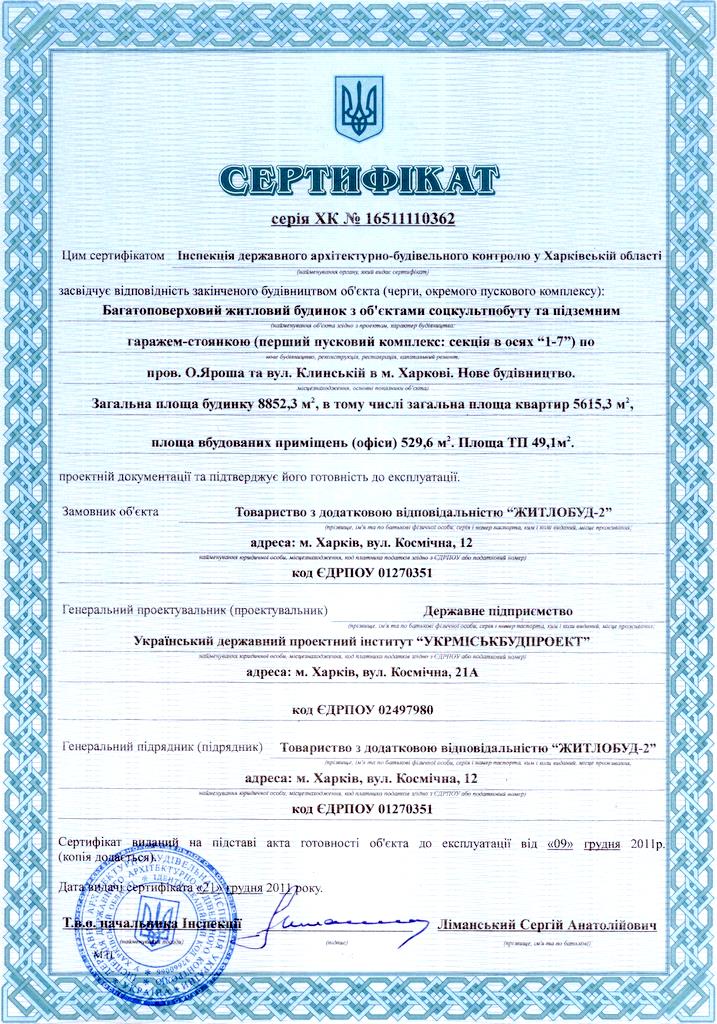 Факт готовности объекта в эксплуатацию подтверждает Сертификат ХК № 16511110362 от 21.12.2011 г. о соответствии завершенного строительством первого пускового комплекса многоэтажного жилого дома с объектами соцкультбыта и подземным гаражом-стоянкой по пер.Отакара Яроша угол ул.Клинской в Харькове проектной документации, выданный Инспекцией государственного архитектурно-строительного контроля в Харьковской области.