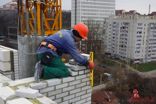 Каменщики продолжают кладку наружных стен 10-го этажа жилого комплекса «Дом с ротондами». На 5-6 этажах ведется кладка внутренних перегородок.