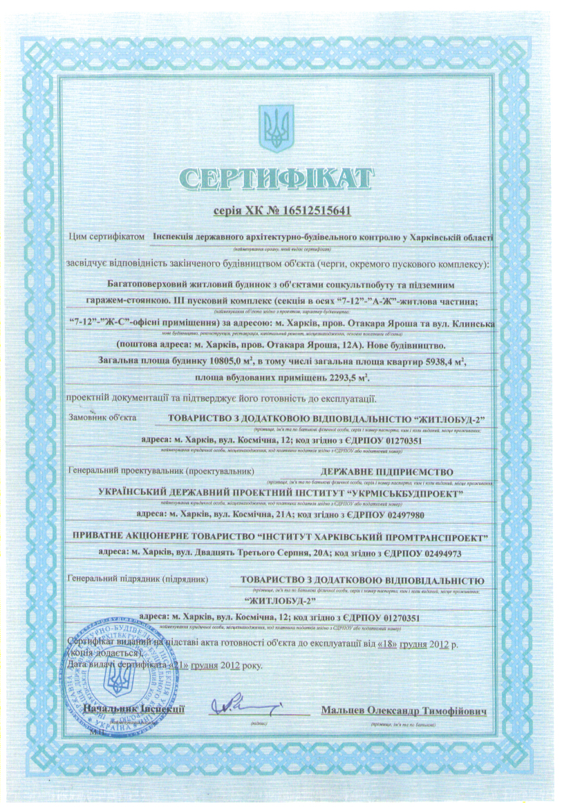 Факт готовности объекта в эксплуатацию подтверждает Сертификат ХК № 16512515641 от 21.12.2012 г. о соответствии завершенного строительством третьего пускового комплекса многоэтажного жилого дома с объектами соцкультбыта и подземным гаражом-стоянкой по пер. Отакара Яроша, 12-А в Харькове проектной документации, выданный Инспекцией государственного архитектурно-строительного контроля в Харьковской области. Общая площадь секции составляет 7753,3 кв.м, в том числе общая площадь квартир - 5382,3 кв.м.