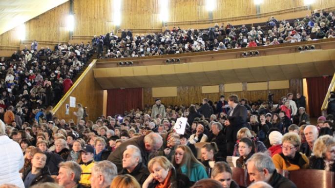 Общественные слушания начались вчера в 18:30 в ККЗ «Украина» с исполнения государственного гимна проукраинскими активистами. В зале к тому времени собралось уже более 3 тысяч человек.